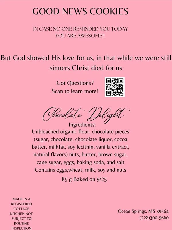 Good News Cookies is a cottage based mobile business in Ocean Springs, MS. We offer a variety of small batch, fresh baked cookies that we sell directly to you! All of our products are made using high-quality ingredients to ensure that every bite is a delight! Order by the dozen any time! We will post our pop-up events and market locations on our website and on social media, so you don't miss your chance to try our delicious cookies and to Spread